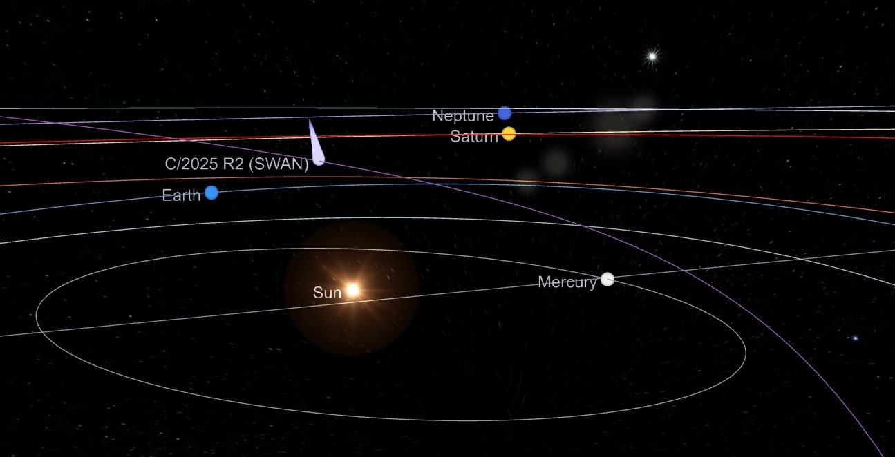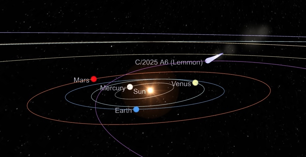 Comète C/2025 A6 (Lemmon) Découverte La comète C/2025 A6 (Lemmon) a été découverte le 3 janvier 2025 par le Mount Lemmon Survey, un programme d’observation situé en Arizona, aux États-Unis. Lors de sa découverte, elle était encore très lointaine, à environ 4,5 unités astronomiques (UA) du Soleil, et apparaissait sous forme d’un objet faible, de magnitude approximative de +21,5 (donc extrêmement faible). Comme c'est souvent le cas pour les comète, à l’époque, elle a d’abord été considérée comme un astéroïde (c’est-à -dire sans activité cométaire évidente) jusqu’à ce que des observations ultérieures révèlent une coma (l’enveloppe diffuse de gaz/poussières) et parfois une queue ténue.En remontant dans les archives photographiques (opération dite de « precovery »), des images antérieures à la découverte ont été identifiées, notamment des images du 12 novembre 2024. Cela a permis d’allonger l’arc d’observation, c’est-à -dire la période pendant laquelle on observe l’objet, ce qui est précieux pour déterminer précisément son orbite. Orbite Grâce aux observations (117 positions observées entre le 12 novembre 2024 et le 14 août 2025 dans l’un des premiers calculs) et à l’analyse de l’orbite par des astronomes comme Syuichi Nakano, on a pu déterminer que la comète aura son périhélie (passage au plus près du Soleil) le 8 novembre 2025, à une distance d’environ 0,5299 UA (soit ~79 millions de km) du Soleil. Son orbite est très allongée (excentricité élevée ~0,9957), ce qui fait d’elle une comète de longue période. Selon les calculs, son entrée dans le Système solaire suit une orbite d’environ 1 350 ans ; après ce passage, le périhélie modifie légèrement l’orbite, donnant une période de retour estimée à environ 1 155 ans. Le point de l’orbite le plus éloigné (aphelie) est estimé à plus de 240 UA dans certaines estimations, ce qui témoigne de son extrême excentricité. Observation Initialement, les prédictions modérées laissaient penser que cette comète resterait assez faible (magnitude ~10). Mais après la conjonction solaire (le moment où elle est très proche du Soleil vu de la Terre) en juillet 2025, elle est réapparue dans le ciel du matin plus brillante que prévu, ce qui a suscité un regain d’intérêt et des révisions optimistes sur son éclat futur. En août 2025, elle a montré une coma d’environ 1 minute d’arc de diamètre dans certaines observations, et des queues plus ou moins développées selon les images.La comète atteindra son plus proche passage à la Terre le 21 octobre 2025, à environ 0,60 UA (≈ 90 millions de km). On prévoit qu’elle pourrait devenir visible (dans des conditions favorables, ciel sombre, faible pollution lumineuse) aux jumelles, voire éventuellement à l’Å“il nu si son éclat continue de surprendre et de s’intensifier. Certains modèles optimistes estiment une magnitude autour de +4 ou même plus brillante, tandis que d’autres restent plus prudents. Trajectoire apparente ![]() Comète C/2025 R2 (SWAN) Découverte La comète C/2025 R2 (SWAN) a été repérée pour la première fois le 11 septembre 2025 dans des images du détecteur SWAN embarqué sur la sonde SOHO : c’est l’astronome amateur Vladimir Bezugly qui a signalé l’objet en scrutant ces images et dont la détection a ensuite été confirmée par d’autres observateurs. Lors de sa découverte elle apparaissait déjà relativement lumineuse pour une détection par instrument solaire, ce qui a attiré rapidement l’attention des astronomes amateurs et professionnels. Des images antérieures (opérations de precovery) datées d’août 2025 ont ensuite été identifiées dans les archives, permettant d’allonger l’arc d’observation et d’améliorer le calcul de son orbite. Orbite Les solutions orbitales convergent vers une comète au périhélie tombant autour du 12 septembre 2025, à une distance d’environ 0,50 AU du Soleil. Son inclinaison est faible (~4,47°) et son excentricité élevée (≈0,993–0,999 selon les jeux d’éléments utilisés), ce qui signifie une orbite très allongée. Selon les estimations fondées sur les éléments publiés, la période orbitale varie selon la méthode et l’arc d’observation retenu : certaines sources donnent une période de l’ordre de ~656 ans, tandis que d’autres, avec une semi-grande axe calculée différemment, reportent des valeurs beaucoup plus longues (résultats sensibles aux choix numériques et aux perturbations planétaires). Ces différences traduisent les incertitudes naturelles quand on déduit la période d’une comète observée sur un court intervalle par rapport à sa période complète. Les observations récentes et l’important jeu de mesures disponibles ont néanmoins permis d’ancrer solidement la date du passage au périhélie en septembre 2025. Observation Au moment de sa découverte la comète était déjà assez lumineuse (estimation initiale autour de magnitude +7 dans certaines mesures) et elle a continué à se renforcer en se rapprochant du Soleil, atteignant des estimations de magnitude proche de +6 fin septembre — suffisante pour être détectée dans des jumelles. Lors de son passage proche de la Terre à la mi-fin octobre 2025 (approche la plus proche vers 20–21 octobre 2025, à l’ordre de 0,25–0,27 AU selon les sources), plusieurs modèles optimistes laissaient penser qu’elle pourrait atteindre une magnitude de l’ordre de +4 à +6, ce qui la rendrait visible à l’Å“il nu sous un ciel bon cielou facilement observable aux jumelles. Toutefois, l’éclat d’une comète peut évoluer de façon imprévisible (épisodes d’activité, fragmentation, ou au contraire déclin), et les pronostics restent donc sujets à révision quand de nouvelles observations arrivent. Les images et rapports qui ont continué d'être publié après le passage au p