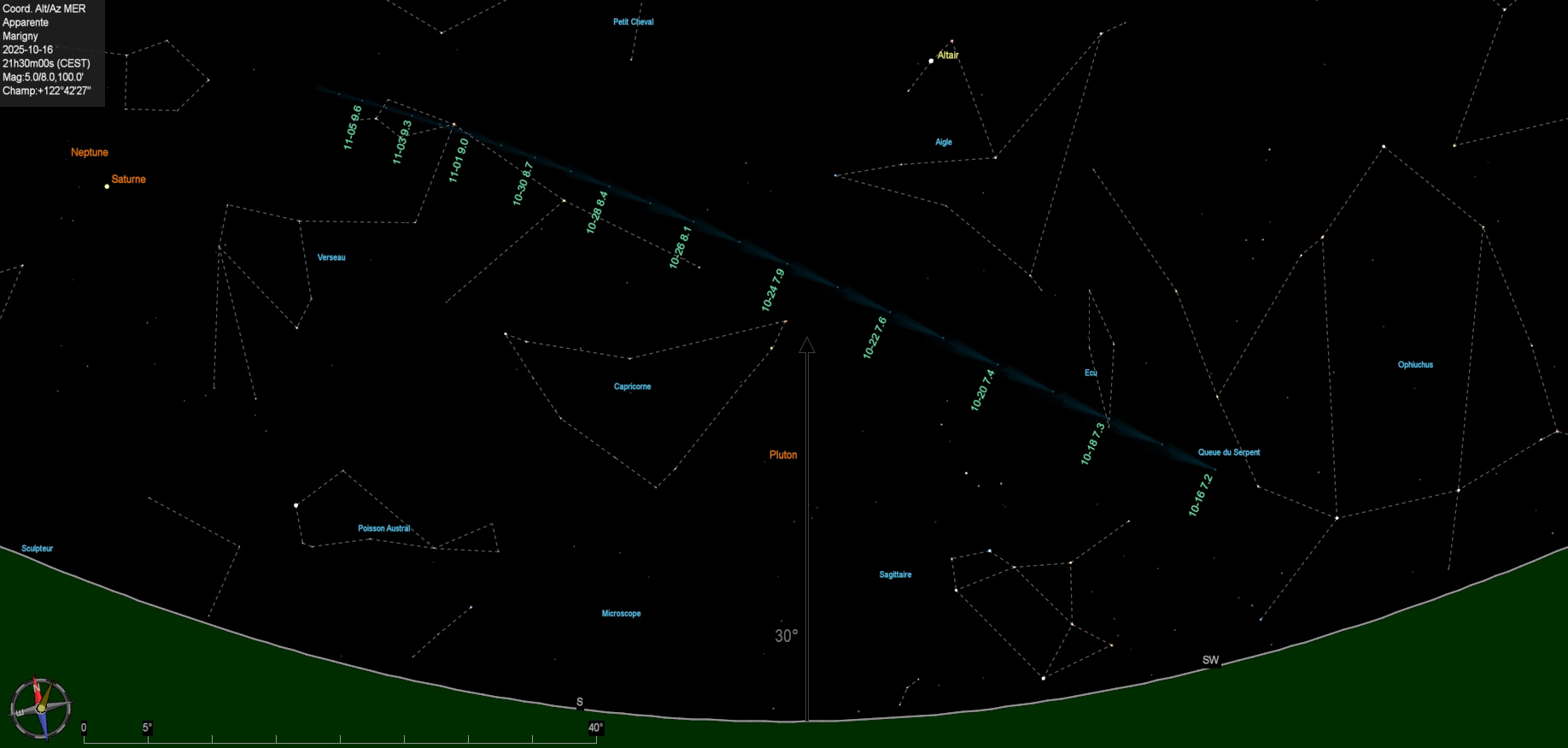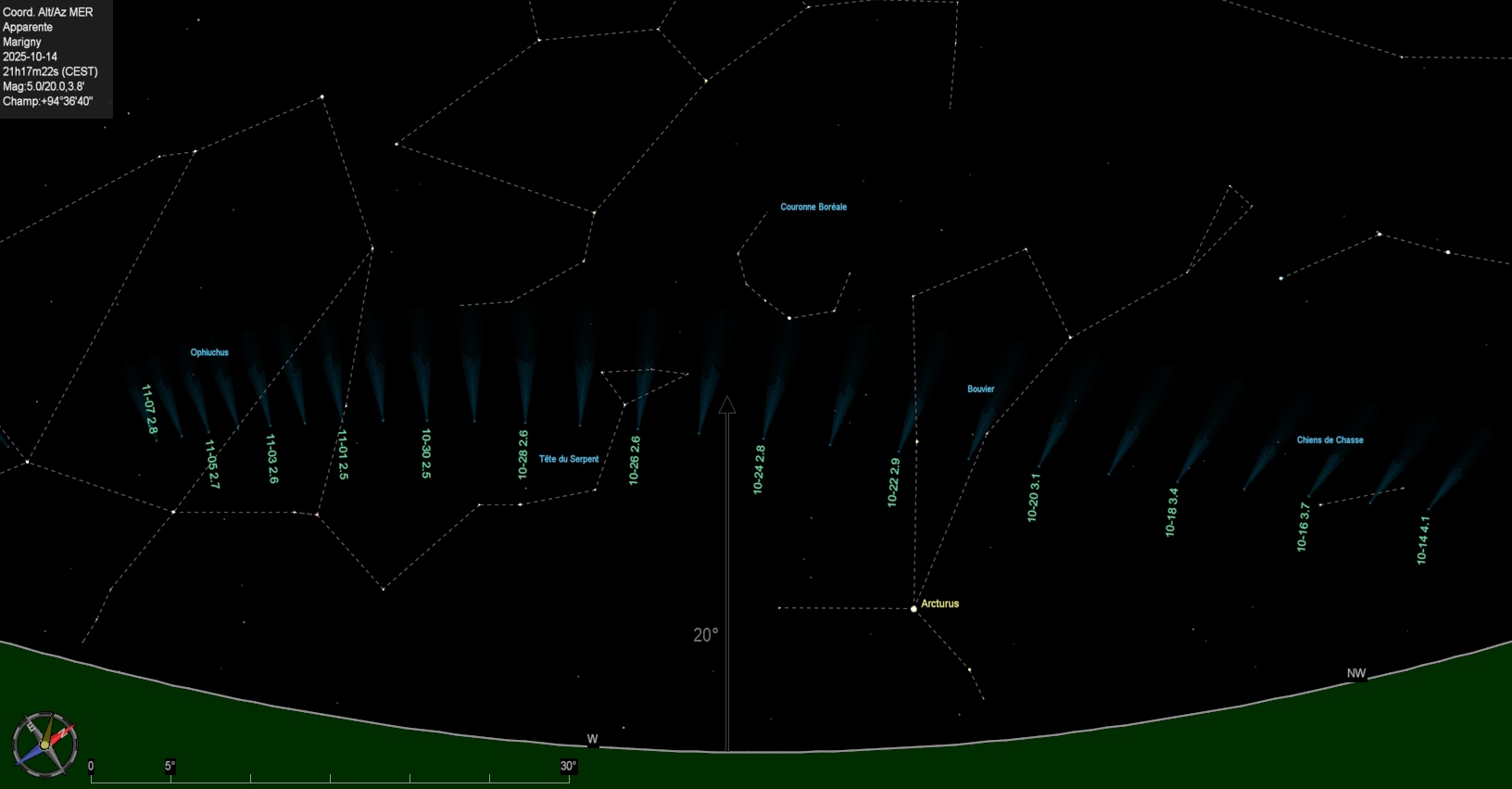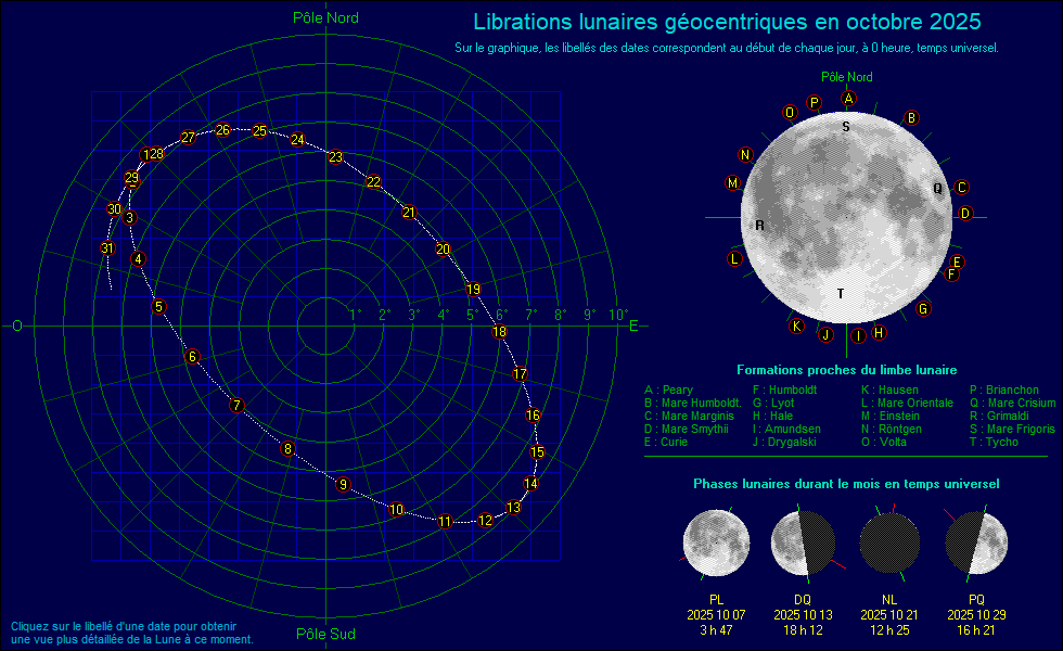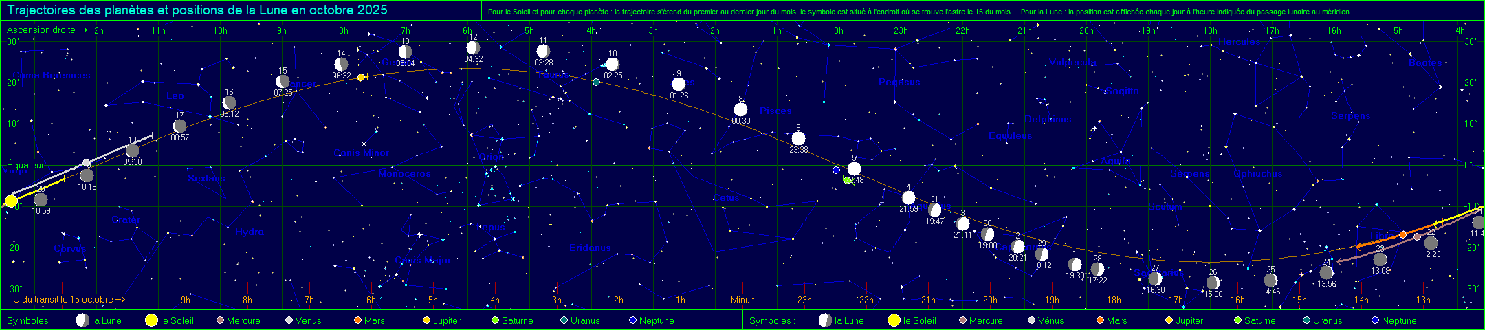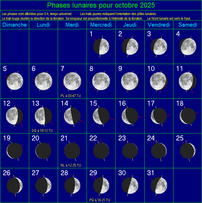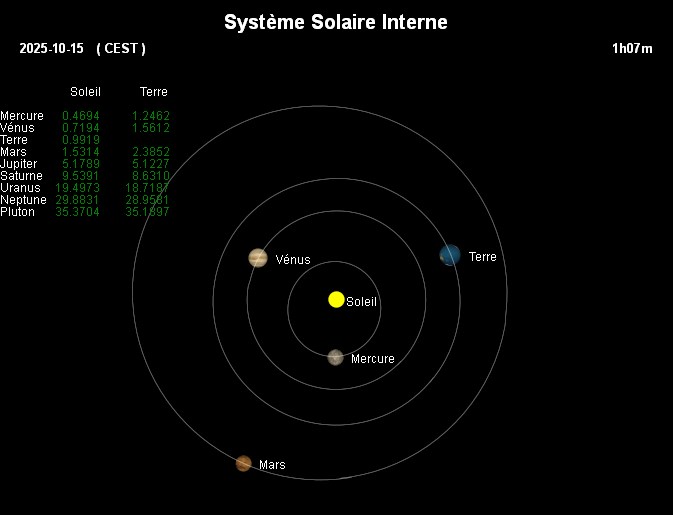Essaims Météoritiques (ètoiles filantes).......................................................................................................................................................... Maximum de l'essaim de météorites des Draconides (DRA) le 08/10/2025 à 19:00 ![]() Maximum de l'essaim de météorites des Orionides (ORI) le 21/10/2025 à 00:00 ![]() Maximum de l'essaim de météorites des Taurides S. (STA) le 05/11/2025 à 00:00 ![]() Maximum de l'essaim de météorites des Taurides N. (NTA) le 12/11/2025 à 00:00 ![]() Maximum de l'essaim de météorites des Léonides (LEO) le 17/11/2025 à 18:00 ![]() Maximum de l'essaim de météorites des Alpha Monocérotides (AMO) le 21/11/2025 à 23:30 ![]() |