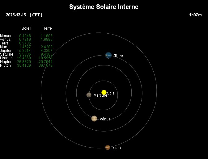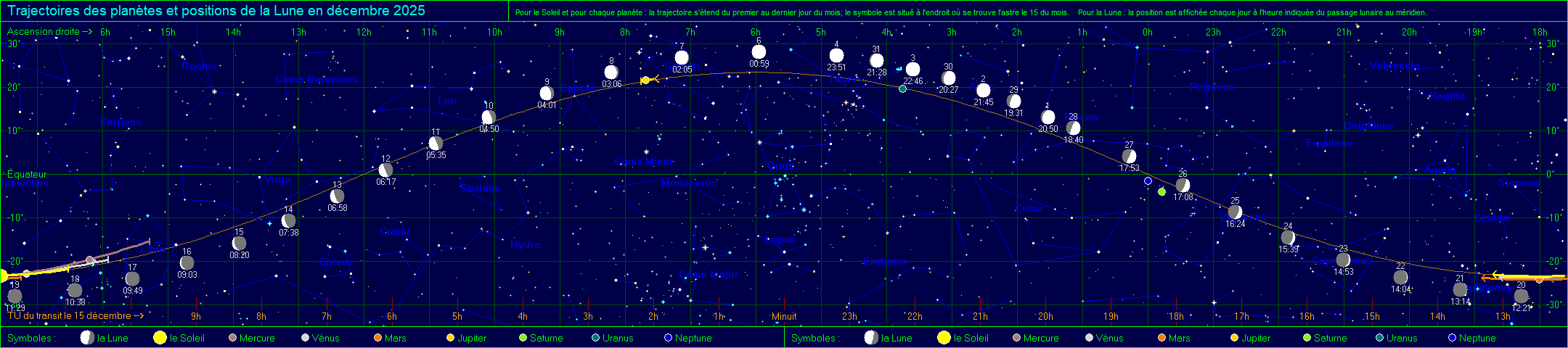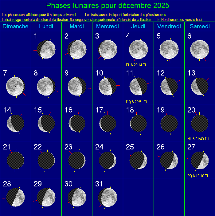 Essaims Météoritiques (ètoiles filantes).......................................................................................................................................................... Maximum de l'essaim de météorites des Phénicides de déc. (PHO) le 01/12/2025 à 00:00 Maximum de l'essaim de météorites des Poupides-Vélides (PUP) le 04/12/2025 à 00:00 Maximum de l'essaim de météorites des Monocérotides (MON) le 09/12/2025 à 00:00 Maximum de l'essaim de météorites des Sigma Hydrides (HYD) le 09/12/2025 à 00:00 Maximum de l'essaim de météorites des Géminides (GEM) le 14/12/2025 à 07:59 Maximum de l'essaim de météorites des Coma Bérénicides (COM) le 16/12/2025 à 00:00 Maximum de l'essaim de météorites des Ursides (URS) le 22/12/2025 à 10:00 |